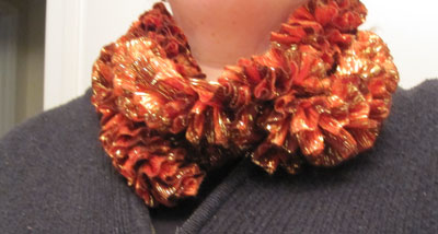 First, a picture of the finished scarf, wrapped around my neck several times as it is somewhere around 10 feet long.
