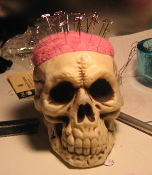 At first I thought I’d make a plush skull to put pins in, but then I thought “no wait, a skull base with a brain pincushion! Perfection!”
