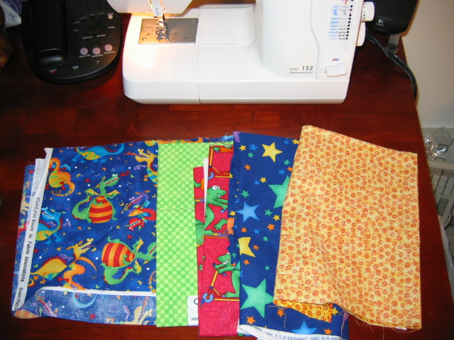 space dragons, lime green checks, frogs on scooters, stars, and red swirlies on yellow background. yay! some of those i've been sitting on for quite a while. this'll probably be a "trip around the world" quilt, because they go quick and i have to have it finished by next weekend. eek! now i'm very grateful for the long weekend. plus this will keep me home and busy and from spending much money this weekend.