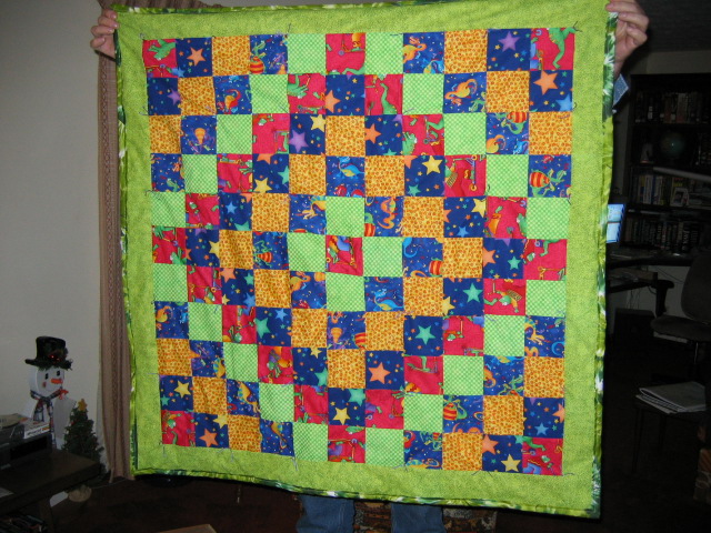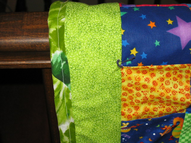 the green fabrics looked better with the other fabrics under the flourescent lights of the wally world. but i'm still happy with it overall. and those fingers you see peeking out from behind the quilt belong to the famous pappydoo.