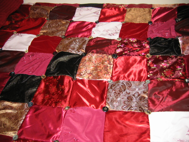 it's satins and silks and brocades and velvets and taffeta. i tacked it with vintage buttons and backed it with a black sheet. 14 may 2005