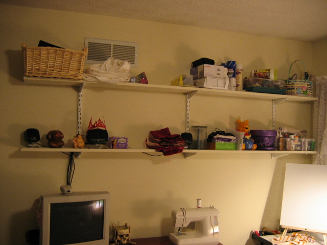 please to be ignoring the paint and such on my work table. besides that, i put up some shelves in my room and painted a new flower pot for my ivy. i think i'll take the ivy to work once i transplant it. look at my desk/shelf area quick, before it gets all jumbled up. but hey, at least i currently have room to work on some projects.